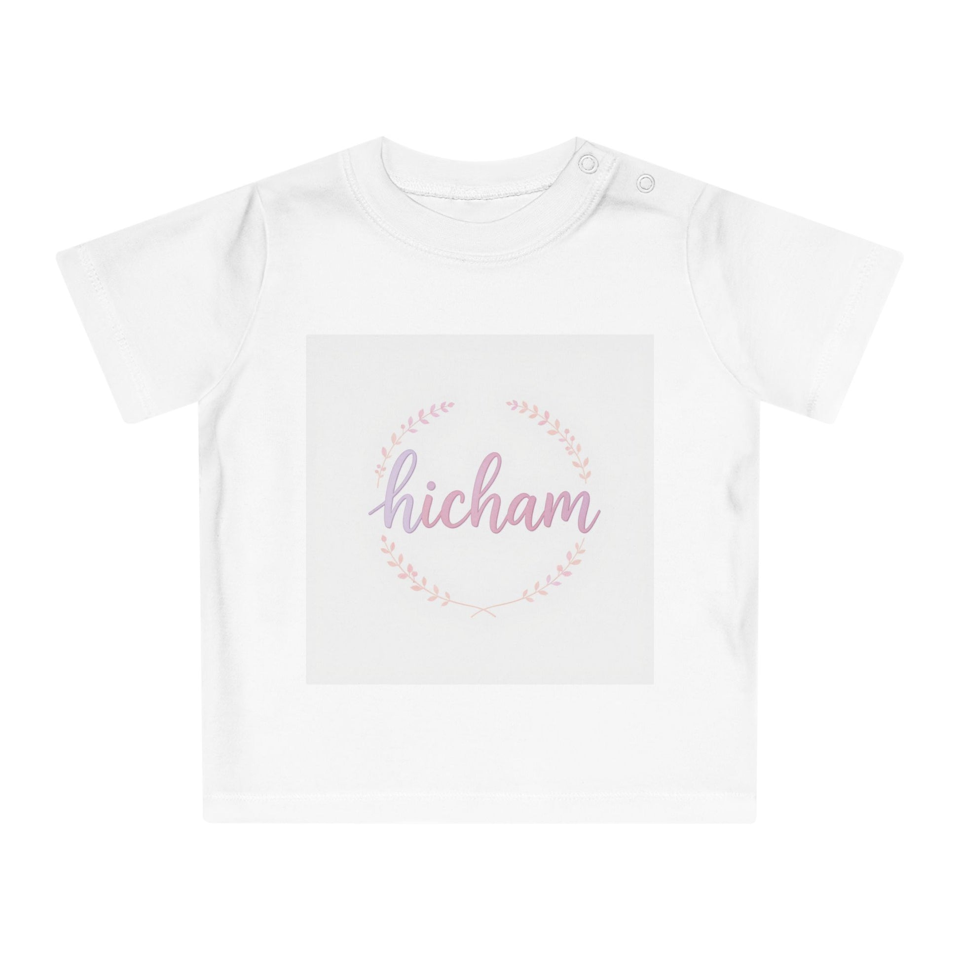 Design: Create a clean lettering logo of the baby's name: "hicham". Typography: Pacifico. Impression DTG de haute qualité. Confortable et doux pour bébé / kids. Disponible en blanc, plusieurs tailles. Conseils d'entretien: laver à l'envers à 30°C, pas de sèche-linge. Design marker: mk_mey4xufz712xbi