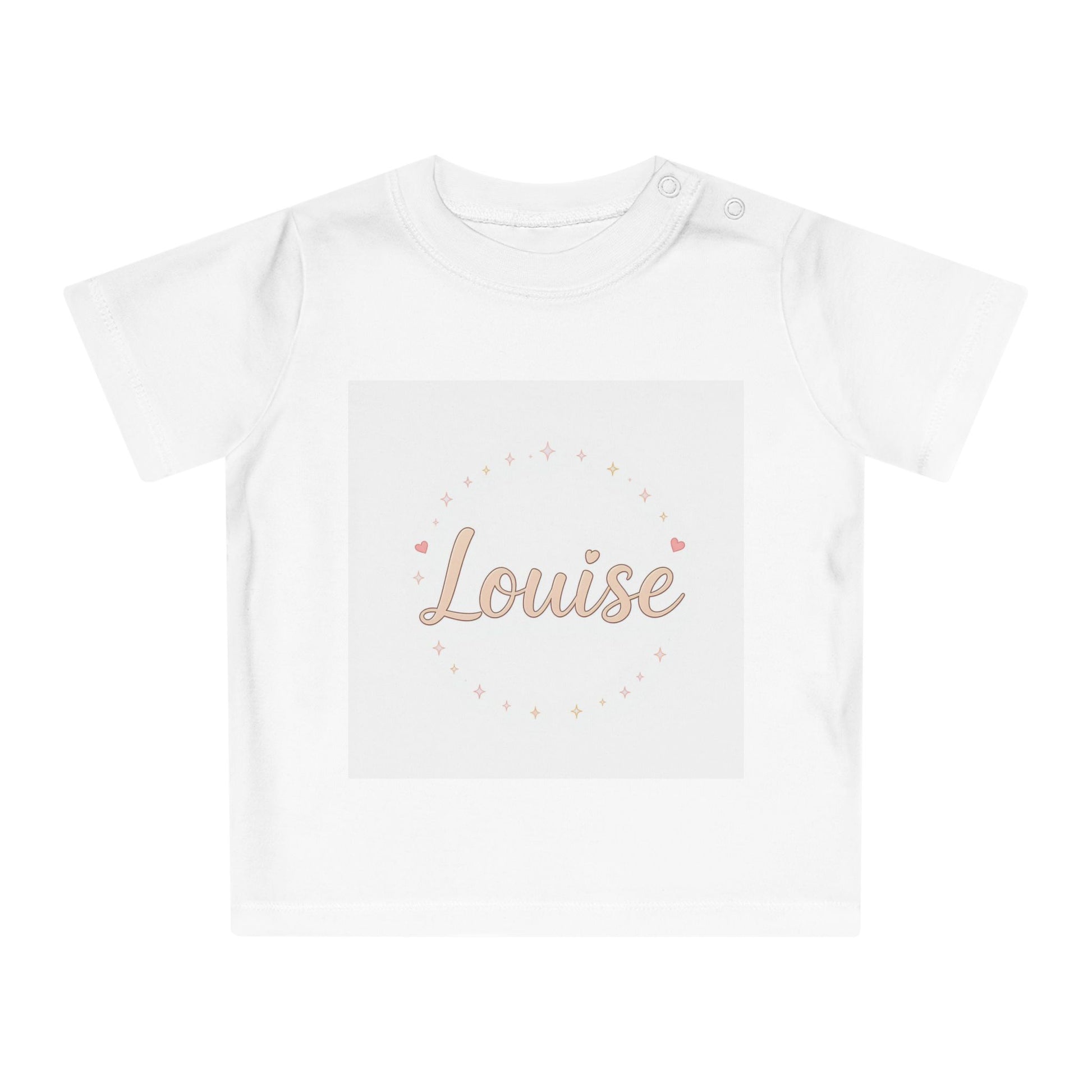 Design: Create a clean lettering logo of the baby's name: "Louise". Typography: Pacifico. Impression DTG de haute qualité. Confortable et doux pour bébé / kids. Disponible en blanc, plusieurs tailles. Conseils d'entretien: laver à l'envers à 30°C, pas de sèche-linge. Design marker: mk_mey7vd6e3hfyrl