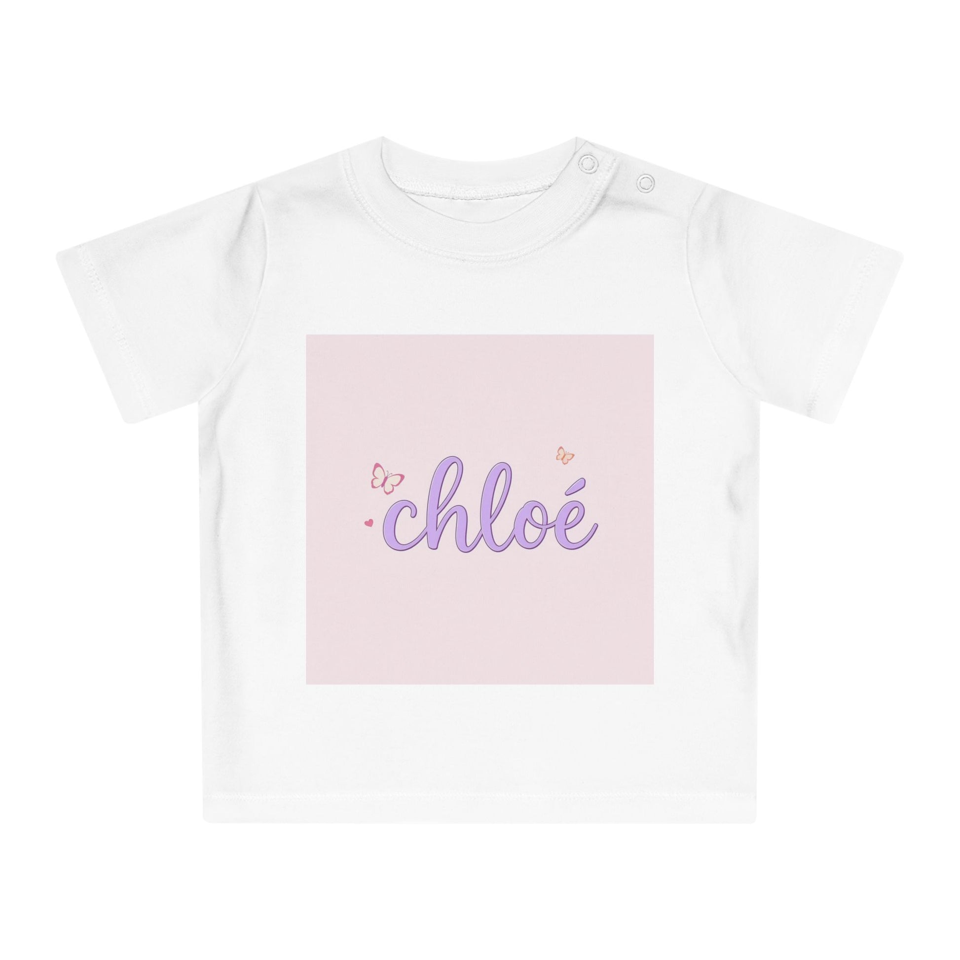 Design: Create a clean lettering logo of the baby's name: "chloé". Typography: Pacifico . Impression DTG de haute qualité. Confortable et doux pour bébé / kids. Disponible en blanc, plusieurs tailles. Conseils d'entretien: laver à l'envers à 30°C, pas de sèche-linge. Design marker: mk_meydcb2j2utgbk